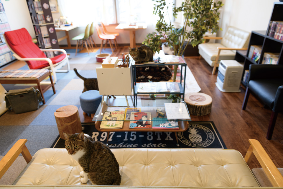オーナーが人一倍清潔さに気を使っている店内は広々としていて、猫も人もまったり過ごせます。また、その名の通り、漫画から猫写真集まで約4,000冊と蔵書も充実♪猫を愛でながら、ぜひ読書もお愉しみを。