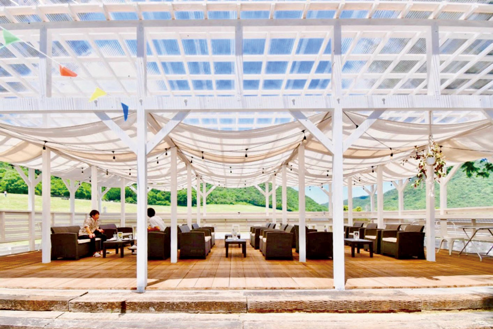 牧場の一画に昨年7月オープンしたのは、可愛くて真っ白なカフェテラス&BBQスペース。