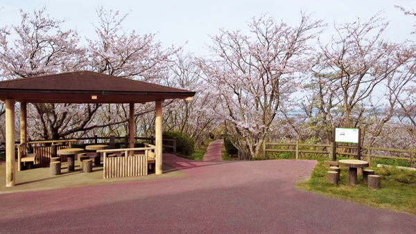 ウォーキングコースとしても人気の桜の名所。桑山の中腹にある広場からは桜並木が連なり、頭上を覆うように淡いピンク色で包まれます。神社近くの「ふれあいの広場」ではライトアップも実施され、夜桜観賞を楽しめます。