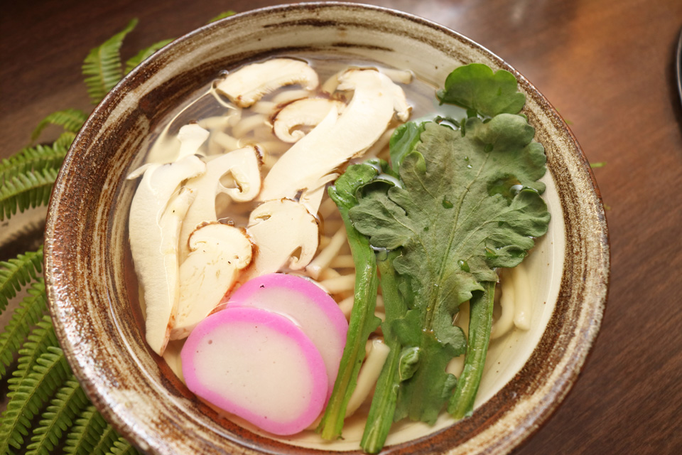 製麺店から仕入れているつるっともちもちした麺の上には、贅沢にも厚切りされた採れたての「阿東産松茸」がトッピングされ、豊かな香りを漂わせます。松茸の香りをより感じられるようにと合わせた濃すぎず薄すぎない絶妙なバランスのお出汁は、ついつい飲み干してしまうほど。