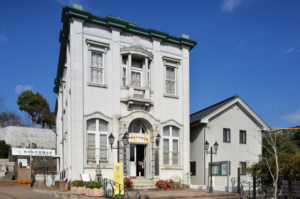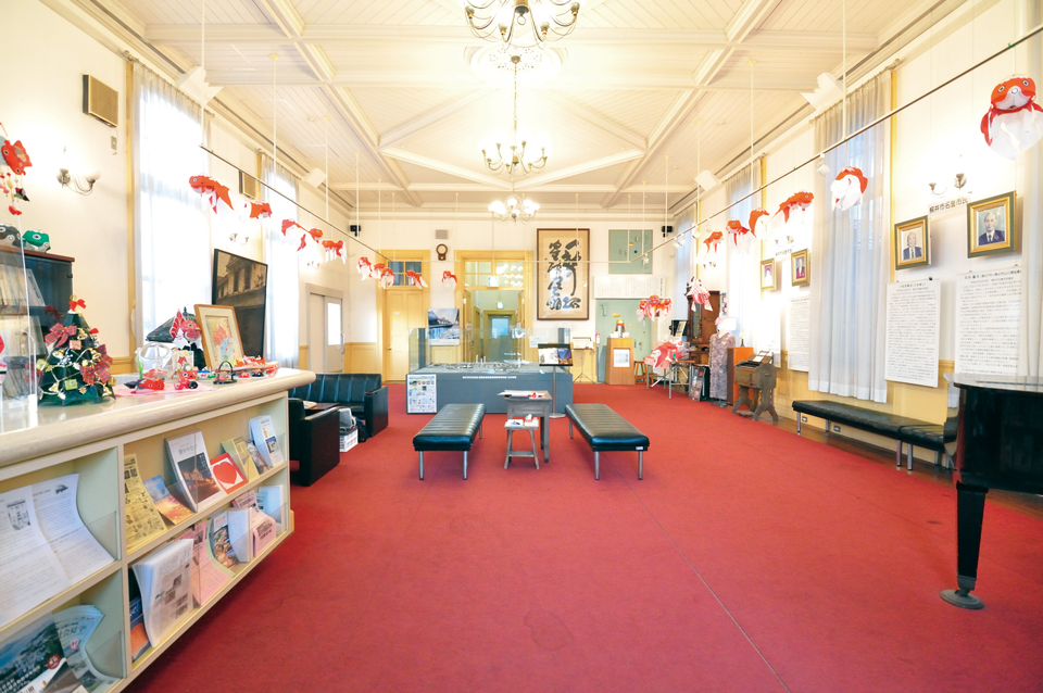 明治40年(1907年)建築の元銀行を活かした資料館。国の登録有形文化財にも指定されているこの建物は、1階は町並み保存地区の町家模型の展示を、2階は柳井市出身の歌手・松島詩子の記念館として柳井の歴史を伝えています。また1階奥には真鍮製の「お鐘金魚」が鎮座。お鐘金魚に小銭を入れると、幸運を運んでくれるかも?