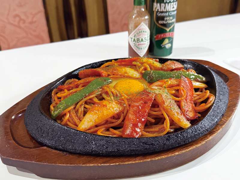 高火力で一気に炒めて旨味倍増の、鉄板のせイタリアンスパゲティ¥850。数種類ものスパイスをブレンドした自家製ソースが味の決め手。