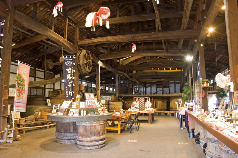 1830年創業の佐川醤油店。かつて岩国藩主・吉川公がその芳醇な味と香りに思わず歓声を上げたという、柳井の特産品・甘露醤油の味わいを伝統の技で受け継いでいます。醤油蔵の一部は資料館として公開され、大きな杉桶や醤油作りの道具の展示も。醤油の製造過程を気軽に見学することができますよ。また、施設内には醤油や醤油を使ったふりかけなどの販売もあり。